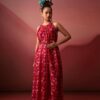This dress features a striking ombre effect, transitioning from pale blue to vibrant fuchsia. The tiered silhouette creates a flowing, voluminous skirt. Delicate floral embroidery adds a whimsical touch to the minimalist design.